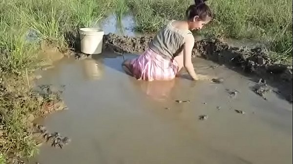 Красавица девушка ловит рыбу вручную